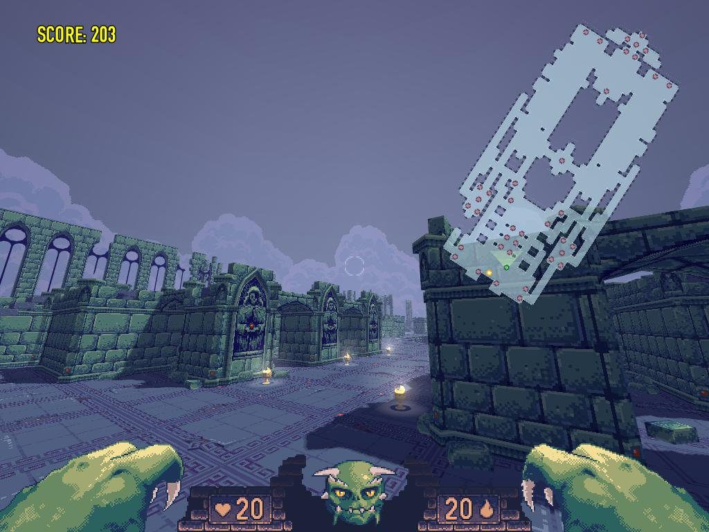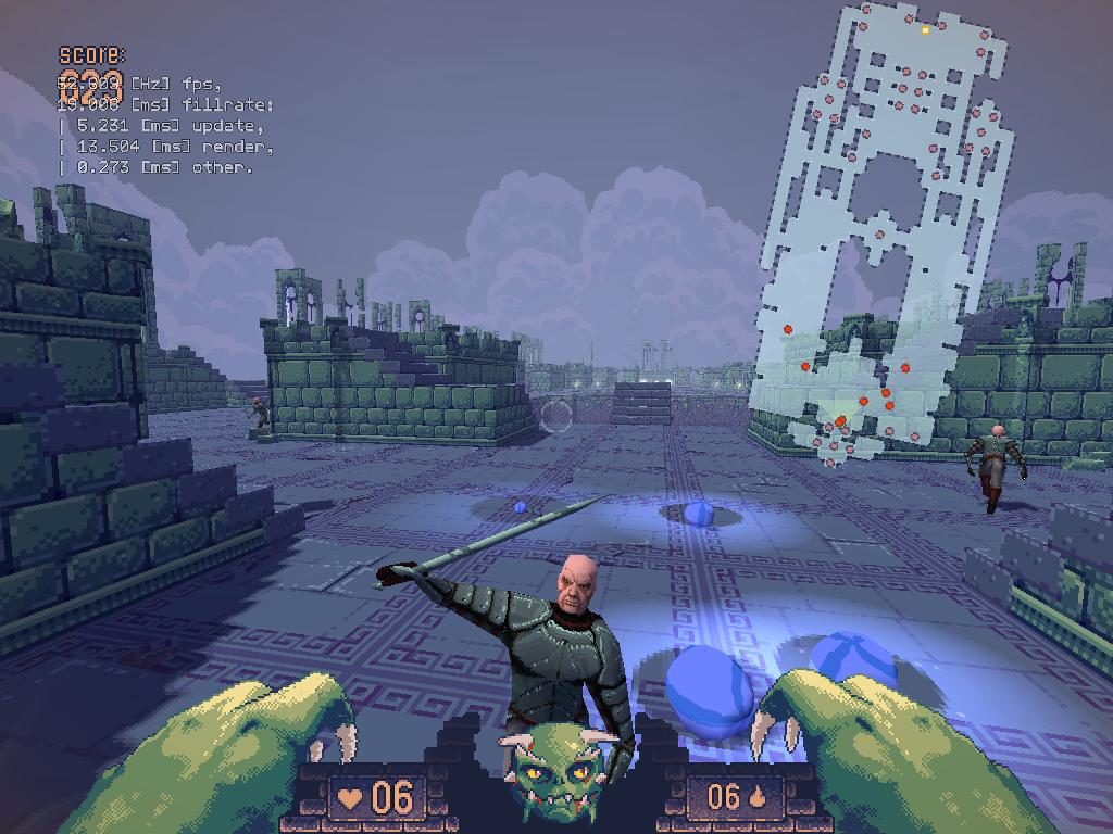 Come già detto, l’aspetto ricorda molto Quake, in particolar modo nelle animazioni lente e nelle meccaniche dei nemici che, tuttavia, sono molto meno stupidi di quello che possono sembrare. La creatura, per difendere sé stessa e il tesoro, sputa fiamme in modalità lineare o conica, da alternare in base alla quantità di nemici, ed è molto più veloce e agile degli avversari: si possono infatti effettuare salti doppi o tripli.