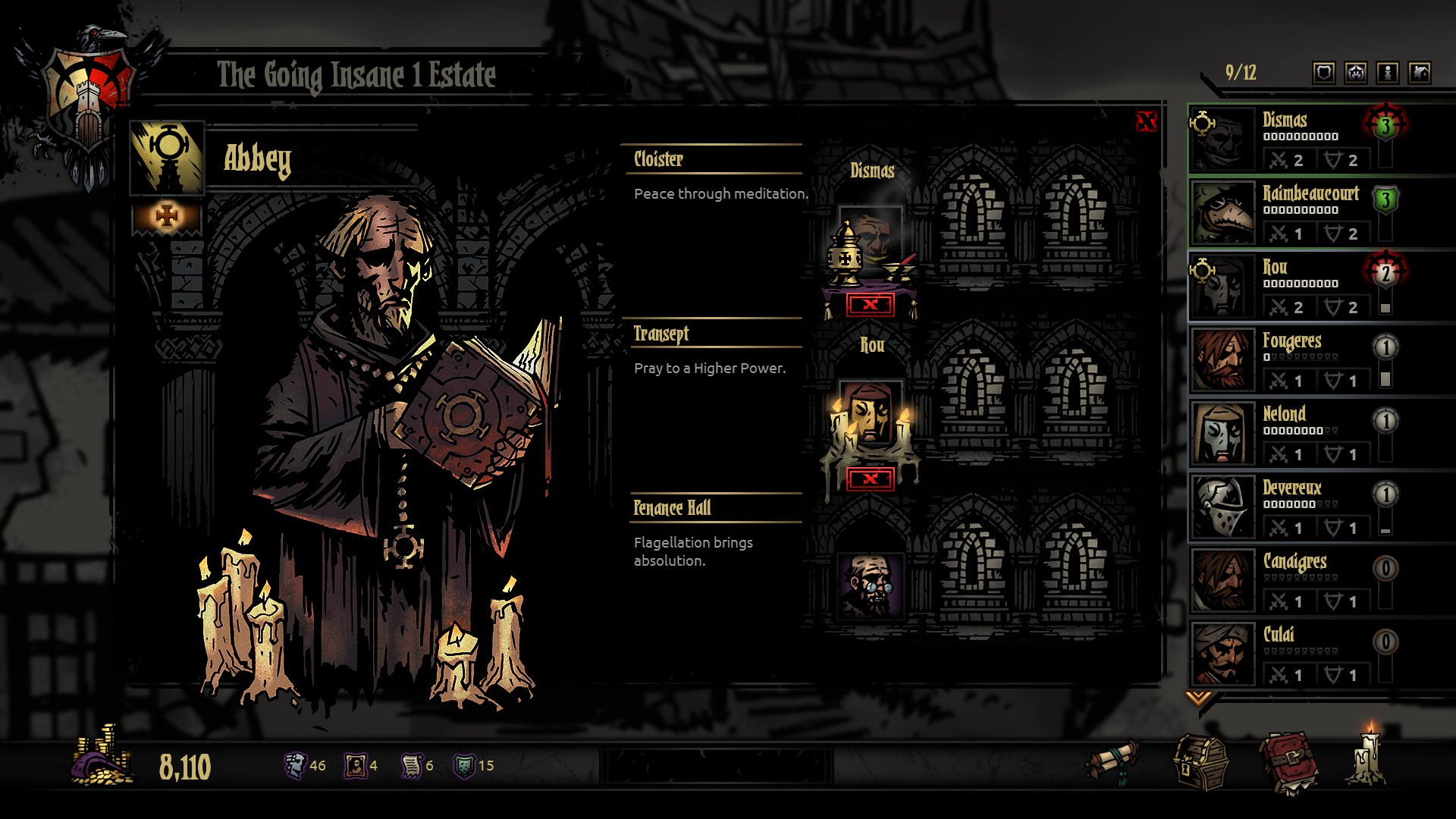 Subito dopo un filmato introduttivo, realizzato in stile cartoon ma dai toni estremamente cupi e inquietanti, la voce narrante del nostro avo ci conduce letterariamente nei nostri primi passi illustrandoci i pericoli e le insidie nascoste già nella strada verso casa. In questo modo ci imbatteremo nel primo approccio vero e proprio al gioco tramite un rapido tutorial (due stanze e un corridoio) che ci illustra in modo molto sbrigativo l’interfaccia di gioco e il sistema di combattimento mentre altri elementi saranno rivelati man mano che si procede nella nostra discesa nell’oscurità. Fin dalle nostre prime mosse è evidente come Darkest Dungeon non sia il tipico GDR esplorativo ma racchiuda, tramite uno stile 2D sia di personaggi che ambienti, un’ambizioso e originale approccio di gioco. Il titolo di questo paragrafo non è un caso: i nostri personaggi si muoveranno uno dietro l’altro e non solo per un mero fattore estetico in quanto ogni tipologia di avventuriero andrà collocato nel party in modo coscienzioso. Inizialmente guideremo le gesta di due personaggi: un crusader (crociato) e un highwayman (bandito). Ogni classe presenta varie abilità e peculiarità che le rendono uniche e adatte a varie situazioni come ad esempio il bandito che, padroneggiando armi a lunga gittata come le pistole, sarà senza alcun dubbio posizionabile in seconda o terza linea. La fase esplorativa risulta molto importante perché potremo rinvenire possibili tesori, ma anche trappole, libri ecc. che condizioneranno lo stress del personaggio. Questo preambolo ci porta all’elemento maggiormente interessante e sicuramente più originale di Darkest Dungeon: l’Affliction System.