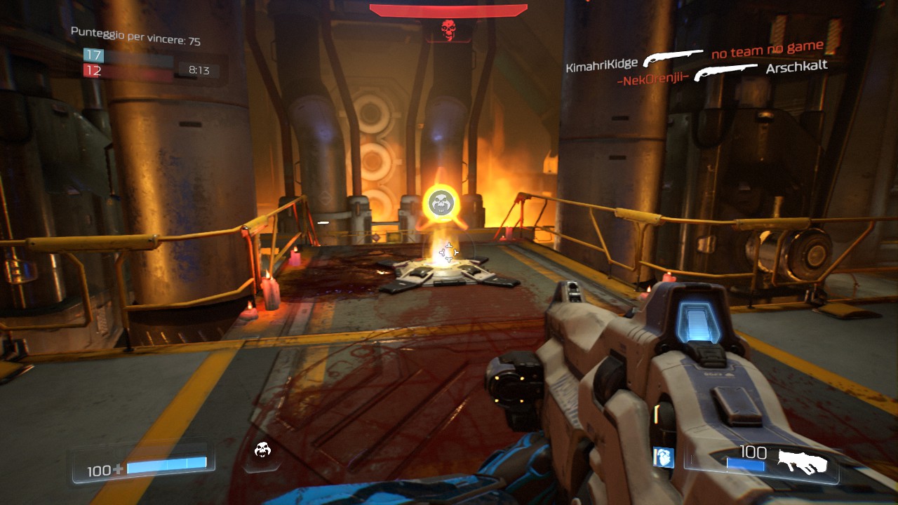 Fin da subito si sono evidenziati due elementi preponderanti della modalità multigiocatore di Doom, la frenesia e lo splatter. Dopo la scelta della classe, da cui dipende il set di armi a nostra disposizione, e una breve attesa per la ricerca di altri giocatori tramite matchmaking ci siamo visti catapultare all’interno dell’arena di gioco. Fatto questo, non rimane molto tempo per pensare e si parte subito in una frenetica lotta per uccidere e non essere ucciso. Le prime partite, soprattutto in Deathmatch a Squadre, sono state spiazzanti sia per gli abbinamenti non ancora perfetti che ci hanno messo contro giocatori di livello molto più alto rispetto al nostro, sia per la velocità con sui si svolge tutta l’azione in entrambe le modalità proposte. Innegabile il senso di deja vu che i “quaker” vecchia scuola potranno trovare nel multiplayer di Doom non solo per la velocità dell’azione ma anche per i salti, i power up e altri elementi retrò inseriti da Id Software. Per varie componenti del gioco è stato fatto un lavoro di innovazione guardando al passato, come dimostra Via della Guerra. La classica modalità dominazione è stata infatti rivisitata rendendola molto più dinamica: la zona da controllare non si sposterà più da un punto all’altro rimanendo poi statica ma sarà in perenne movimento seguendo il percorso della mappa mentre i punti verranno accumulati in modo usuale, controllando la zona e difendendola dagli assalti nemici.