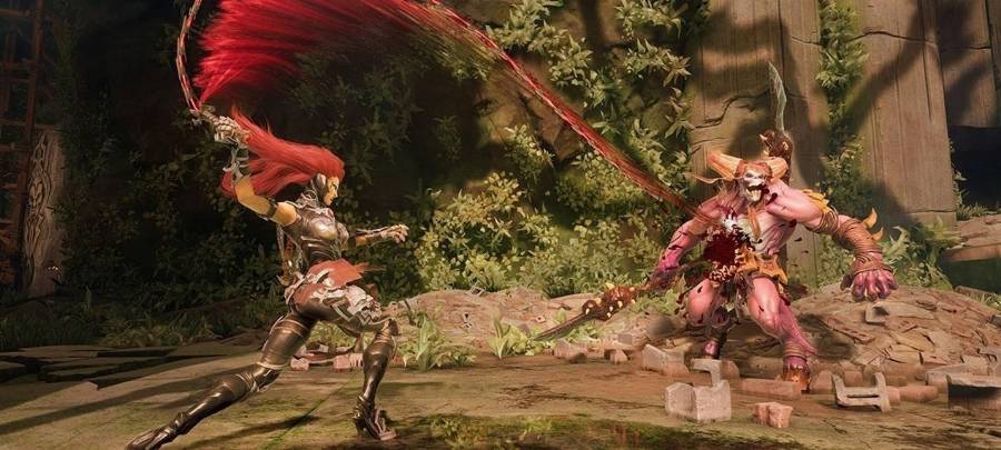 La demo mostrataci dai ragazzi di Gunfire Games iniziava quasi immediatamente con la battaglia contro Invidia, il primo dei sette Peccati Capitali. Per quanto relativamente semplice nei pattern e nelle fasi in cui si evolveva lo scontro, è stato interessante vedere come le boss fight di Darksiders III dispongano di parecchia varietà. Ad esempio, a un certo punto dello scontro Invidia è volata in alto al centro della stanza in cui la stavamo affrontando, e l’unico modo per farla tornare a terrà è stato raggiungerla in una breve fase platform dove bisognava dondolarsi tra una piattaforma e l’altra grazie all’utilizzo della catena. Una volta a terrà, si abbiamo potuto colpirla con le varie combo della frusta in combinazione con alcuni degli attacchi magici di Furia. Molto importante è stato non farsi prendere dalla fretta e pazientare in attesa che il nemico ci attaccasse per poi schivare e contrattaccare.