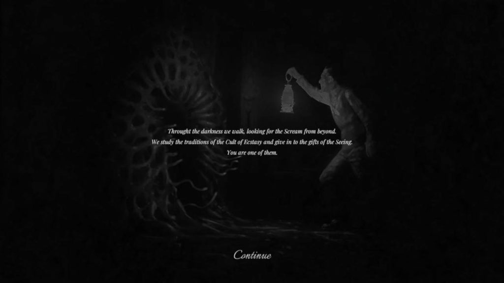 La demo si apre in un luogo fatto di forme e ambienti “vivi”, quasi fossero di carne carne, con forme e apparenze che ricordano le opere cinematografiche e artistiche dei già citati Giger, Cronember e Beksinski. Esplorando questo luogo alieno, il protagonista si renderà presto conto di essere all’interno di un sogno, che terminerà dopo lo sfortunato incontro con una delle creature aberranti che lo abita. Nonostante quanto visto nel sogno terrebbe alla larga qualunque persona normale, protagonista e culto paiono fortemente intenzionati a trovare un modo di entrare fisicamente nel mondo rappresentato da quei sogni.