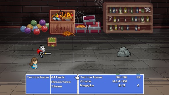 Abbiamo prima citato la cosiddetta quarta parete come uno degli elementi che balza subito all’occhio al giocatore, ma non è tutto: Terrorbane si pone come primo obiettivo l’intrattenimento e non è solo la figura dello sviluppatore, continuando a interagire – e disturbare, ovviamente – con il giocatore, a intrattenere. Chiunque abbia trascorso ore nel mondo dei videogiochi non potrà farsi sfuggire alcuni riferimenti parodistici o semplici omaggi a ciò che hanno fatto la storia di questi, come Super Mario, Final Fantasy e Dragon Ball, ma anche alcuni Jrpg più di nicchia come Persona. Lo staff di BitNine Studio eccelle nel tentativo di intrattenere il giocatore con colpi di scena comici e demenziali, ma anche con del puro nonsense (a meno che non vi sia già capitato di avere una cassa della frutta come membro del party in battaglia).