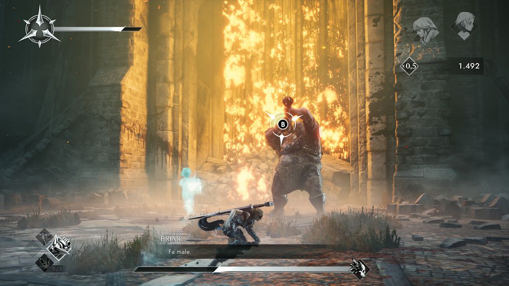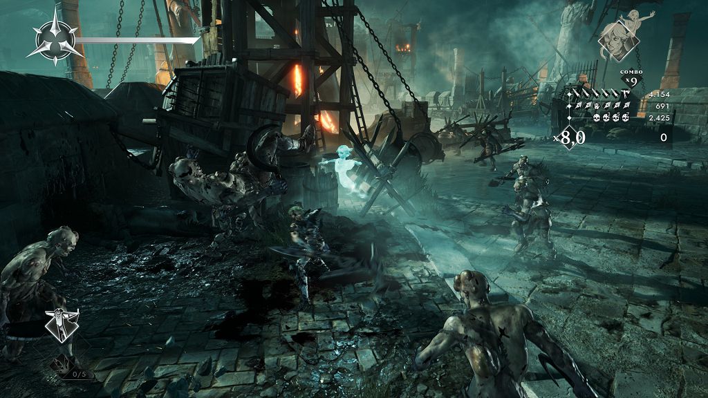 Ad aggiungere varietà c’è anche il fatto che la sorella spirito della protagonista partecipa alla battaglia, sia bloccando gli attacchi col prompt di cui abbiamo parlato prima, sia allungando le combo qualora si sia abbastanza vari nel combattimento. Non è presente uno score a schermo come Devil May Cry (pur essendoci un punteggio con valutazione per ogni settore, allo stesso modo di Bayonetta); al suo posto c’è l’icona di sinergia tra i due personaggi giocabili. Portato al massimo permette allo spirito di effettuare mosse bonus ampliando ulteriormente la potenzialità “stylish” del gioco. I nemici per ora sono piuttosto standard, anch’essi molto derivativi. Una tipologia di mostro ha persino una cutscene quasi identica alla sua presentazione in Devil May Cry V, la quale a sua volta era una citazione al primo capitolo. I boss hanno un feeling molto particolare, c’è un’enfasi sul tempismo di esecuzione delle mosse che li distingue dalle adrenaliniche battaglie di altri giochi del genere.