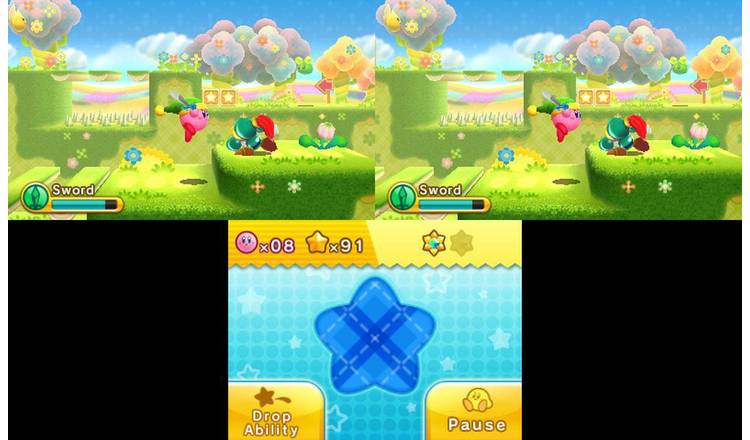 Il titolo del gioco si riferisce alla gimmick di Nintendo 3DS: abbreviando “triple” con 3 e “deluxe” con D, si ottiene Kirby 3D. L’effetto tridimensionale, in realtà, non aggiunge nulla all’esperienza di gioco in sé e per sé considerata, che resta quella di un classico platform in due dimensioni, però è decisamente ben fatto e fa la sua bella figura quando ci sono elementi che si muovono da un piano all’altro, siano nemici o lo stesso Kirby che utilizza la Warp Star.