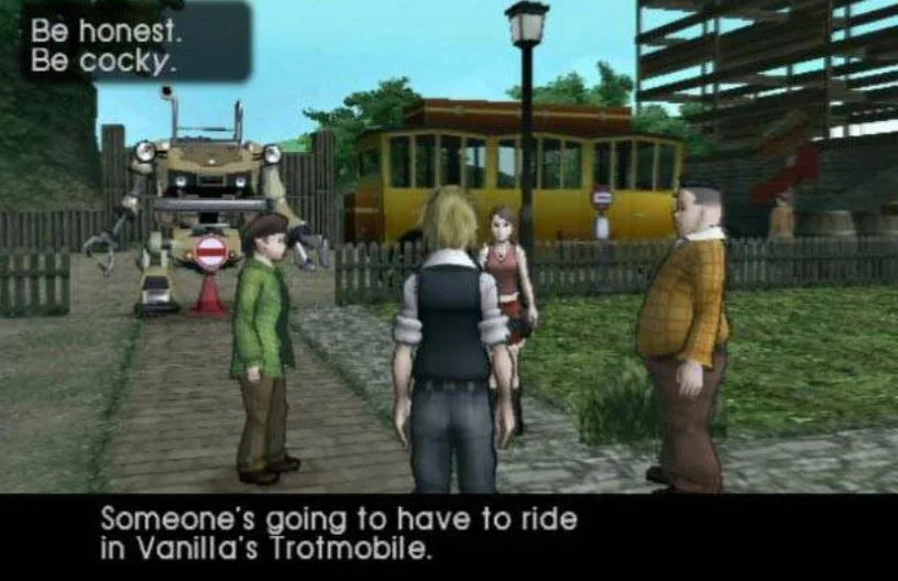 Peccato che la realizzazione tecnica riesca a compromettere l’impatto: se i modelli poligonali di Trotmobile e personaggi principali sono abbastanza curati, lo stesso non si può dire degli NPC, che paiono ciocchi di legno, degli ambienti spogli e delle texture davvero povere; inoltre, caricamenti corposi e un frame rate non solidissimo non aiutano. Per le animazioni bisogna fare dei distinguo: le Trotmobile vantano movimenti ben più curati rispetto a quelli dei personaggi umani, protagonisti inclusi, i quali comunque si muovono nei limiti della decenza. Favorire le Trotmobile nelle ristrettezze dell’ambito tecnico è stata una scelta saggia dal momento che le sezioni di azione si svolgono a bordo di esse. Tutto sommato, poi, è anche più semplice realizzare animazioni credibili per delle macchine, che si muovono meno fluidamente degli esseri umani. Meglio il sonoro, per il quale è più facile chiudere un occhio per gli effetti in favore di una OST di buona qualità. D’altronde, come vedremo in seguito, il gioco si compone pure di una gradevole fase rhythm-game, con diversi brani cantati.