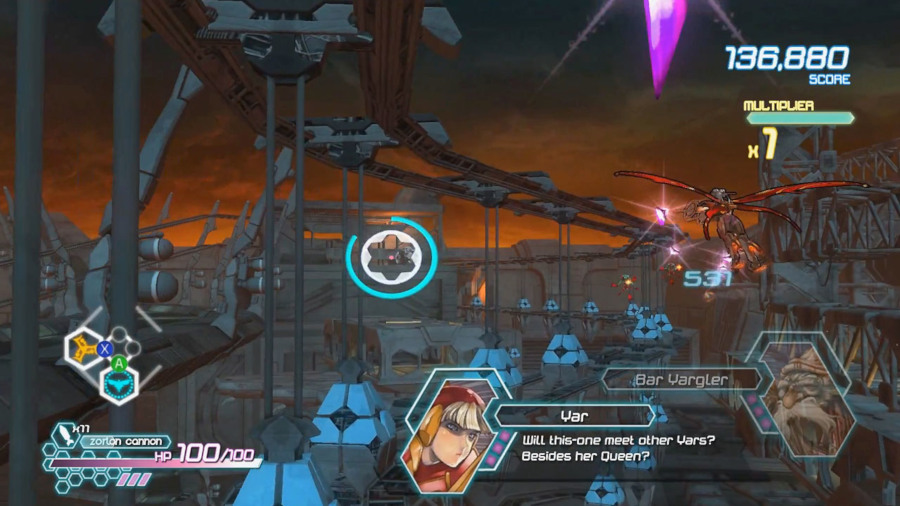 Il secondo è la scarsa immediatezza del sistema di controllo: Killspace Entertainment ha voluto strafare, dotando la nostra Yar di due modalità di fuoco, missili a ricerca e quattro diversi power up. Facendo due calcoli in rapidità, si utilizza il pad quasi al 100%: con la levetta sinistra si muove il personaggio, con quella destra il mirino (e già gestire rapidamente e in modo preciso questi due movimenti non è cosa da poco), con i dorsali di sinistra si usano i missili e il dash, con quelli di destra le due modalità di fuoco, e con i quattro tasti frontali si attivano i power up. Poi ci sarebbe pure lo Zorlon Cannon… Il risultato è che, soprattutto all’inizio, vi capiterà di fare qualcosa che proprio non volevate fare, ad esempio scagliare due missili invece di schivare un colpo con il dash, oppure attivare un power up diverso da quello che volevate, visto che c’è bisogno di memorizzare le icone a essi legate.
