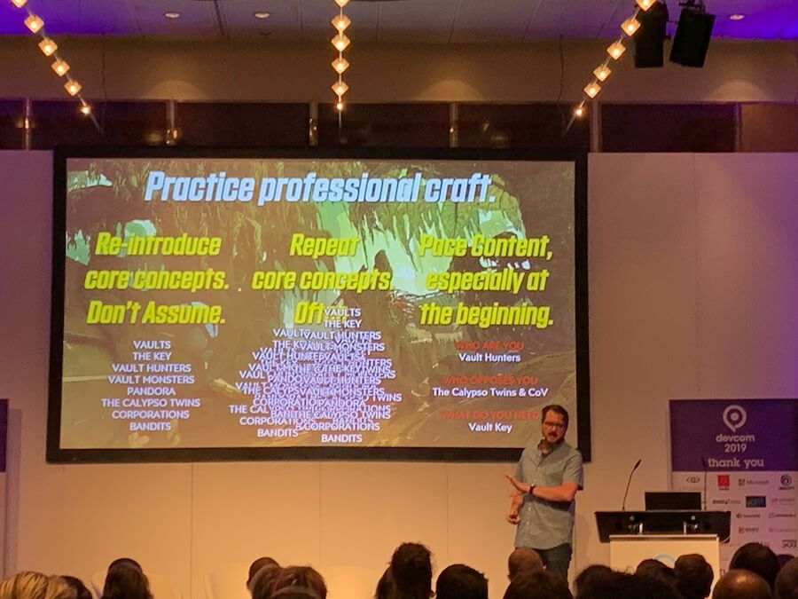Da veterano del settore da più di 25 anni, Randy fa luce sugli aspetti meno “front and center” dello sviluppo di un videogame, condividendo i processi mentali che portano una compagnia come Gearbox Software ad adattare le poco flessibili regole del game design a una realtà così dinamica come quella di Borderlands 3. Dopo una piccola parentesi sulla necessità implicita di un reparto narrativo dedicato, soprattutto in uno studio delle dimensioni di Gearbox, Varnell ha iniziato a parlare delle principali difficoltà nel lavorare sul sequel di una serie così amata. Prima fra tutti?