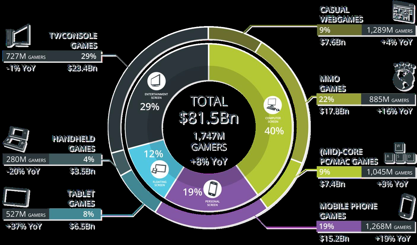 Qualche dato anche sui consumi in Italia, la cui spesa nel mercato dei videogiochi la classifica al 9° posto globale e al 4° in Europa, superata da Francia, Regno Unito e Germania, con 21 milioni di giocatori e 1,5 miliardi di euro spesi nel 2014 (e 350 milioni spesi in hardware da gioco). Interessante notare inoltre come il 75% dei giocatori usino il PC come piattaforma da gioco, mentre solo il 25% sfrutta il tablet a tal scopo.