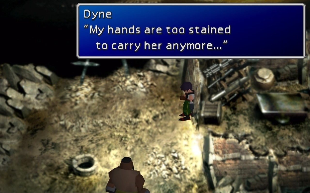 Ce ne rendiamo conto quando giungiamo nella Prigione di Corel, dove ci viene rivelata la sua backstory che coinvolge Dyne, di come la Shinra li abbia privati di tutto: la loro città, le loro famiglie, le loro stesse vite. Quando poi ritroviamo nel deserto l’amico perduto di Barret, ci accorgiamo che di lui rimane ben poco; a differenza di Barret, che ha avuto Marlene come appiglio alla sanità mentale e sprone a combattere per il pianeta, Dyne ha ormai perso qualunque speranza e volontà di vivere. Barret si trova quindi costretto prima a combattere con lui, e poi ad assistere impotente al suo suicidio.