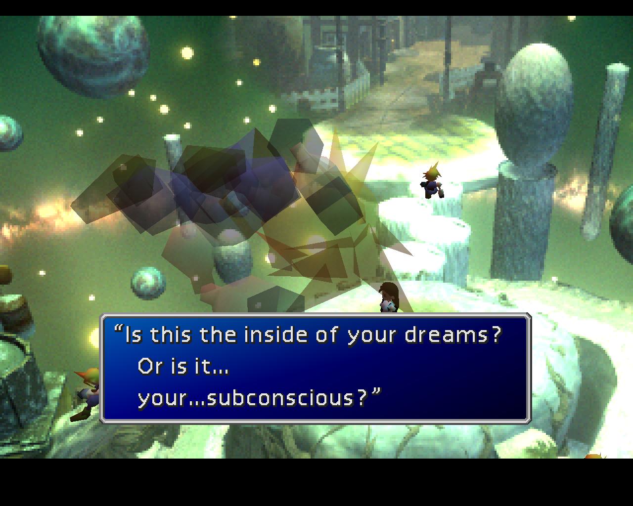 Il viaggio all’interno del subconscio di Cloud è decisamente una delle parti più inconsuete e affascinanti di Final Fantasy VII. A differenza di molti protagonisti di JRPG, Cloud non è semplicemente afflitto da amnesia, piuttosto non riesce a rievocare solo alcuni particolari del suo passato, perché i suoi ricordi sono mischiati con quelli di Zack. A differenza di altri personaggi non c’è una rivelazione di comodo a sistemare le cose, ma con l’aiuto di Tifa deve ricostruire il filo dei suoi ricordi per scoprire la verità sul suo passato, una verità nascosta dalle sue stesse illusioni scatenate dallo shock sia fisico che psicologico che ha subito, e dalle manipolazioni e dalle bugie che gli sono state propinate in seguito.