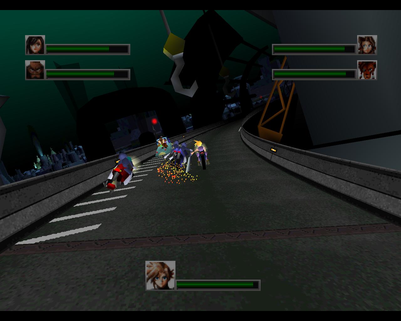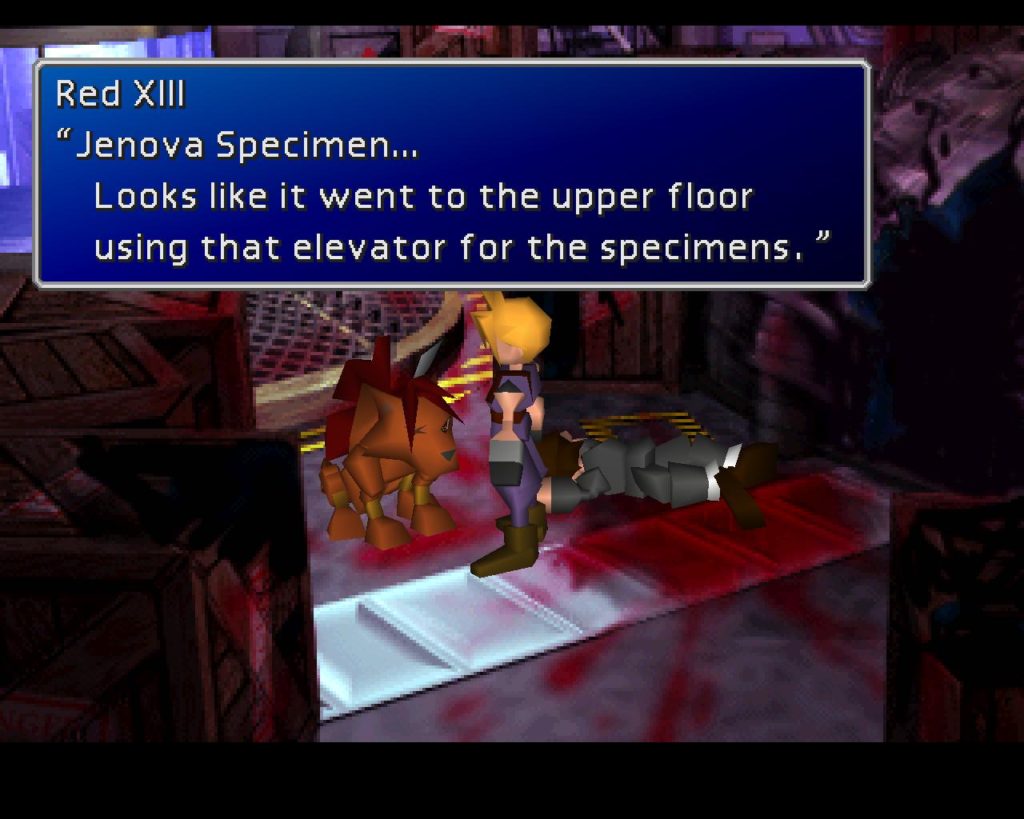 Un altro punto il cui il gioco ci mette di fronte a una situazione di cruda soggezione è l’ultima parte all’interno del Quartier Generale della Shinra. Dopo essere stati catturati, i membri del gruppo si svegliano nelle loro celle inesplicabilmente liberi di uscire. Una musica minacciosa e infausta ci accompagna mentre posiamo gli occhi sui morti disseminati ovunque e la cella di Jenova squarciata e vuota. L’unico esplicito indizio da seguire è la scia di sangue e segni di artigli che ci conduce dritti verso l’ufficio del Presidente Shinra, che troviamo già morto. Il gruppo ha appena il tempo di realizzare cosa sta succedendo che si ritrova a fronteggiare il figlio del presidente: Rufus, che già dalle prime dichiarazioni promette di essere persino peggiore del padre. Da qui in poi inizia una sequenza di eventi sempre più impetuosa: mentre Cloud affronta da solo Rufus, gli altri combattono contro un boss nel doppio ascensore dell’edificio; segue poi la famosa fuga sulla strada sopraelevata a bordo della moto e il furgoncino, che culmina infine con un’ultima boss fight.