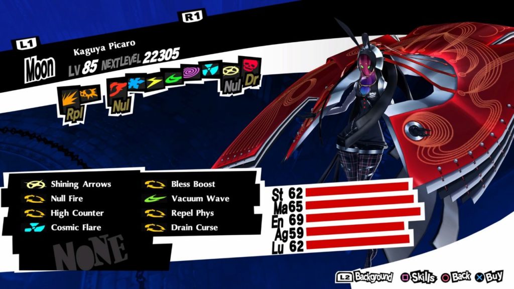 Arriviamo quindi al miglior Persona di Persona 5 Royal. Parliamo di un Persona dlc presenta nel Vanilla, ma che ora è disponibile gratuitamente e integrato nelle fusioni in-game: Kaguya Picaro. Kaguya Picaro è essenzialmente la versione magica di Yoshitsune, con la sua skill unica che rappresenta l’Hassou Tobi magico. Richiede un min-maxing più lungo rispetto a Yoshitsune, ma ci sentiamo di definirla più forte per 3 motivi: