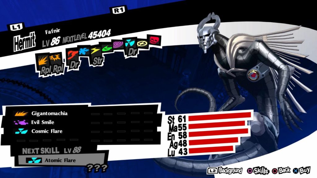 Ci sono 2 tipi di danno fisico in Persona 5 Royal, il danno da colpo e quello da pistola. In questa guida illustreremo sia il miglior Persona per build da pistola, che quello per la build da colpo. Premettiamo che la build da colpo è molto migliore in realtà, tuttavia la pistola ha un’ottimo crit-rate che può venir utile per atterrare nemici senza debolezze. Il miglior Persona per questa categoria è Fafnir, nuova aggiunta di Royal. oltre ad avere ottime difese e nessuna debolezza, Fafnir impara skill che potenziano il danno da proiettile e può ereditare Apt pupil, che potenzia il crit-rate ulteriormente.