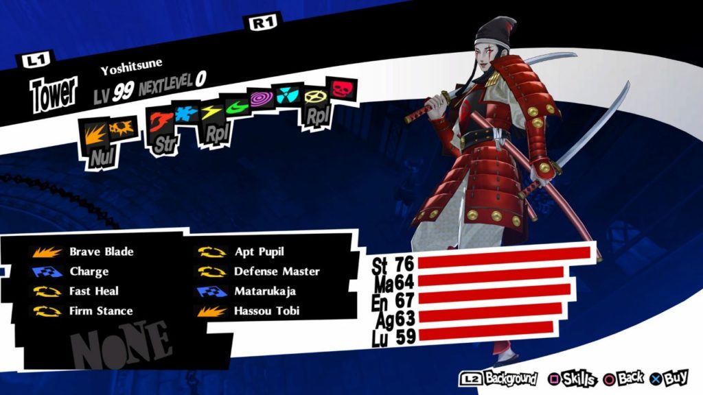 Altre skill utili sono Apt pupil, per i critici, Charge nel caso non abbiate un tank/buffer, e maestro delle armi per diminuire il costo di Hassou Tobi. Il resto è a scelta libera praticamente, potete fargli imparare auto-mataru per evitare un turno di buff, ma è in realtà non necessario se utilizzate Ryuji o Yusuke con il Persona alla terza ascensione. Potete optare sull’accumulare altre passive difensive se volete renderlo più resistente, ma anche senza troppo min-maxing, Yoshitsune è semplicemente letale