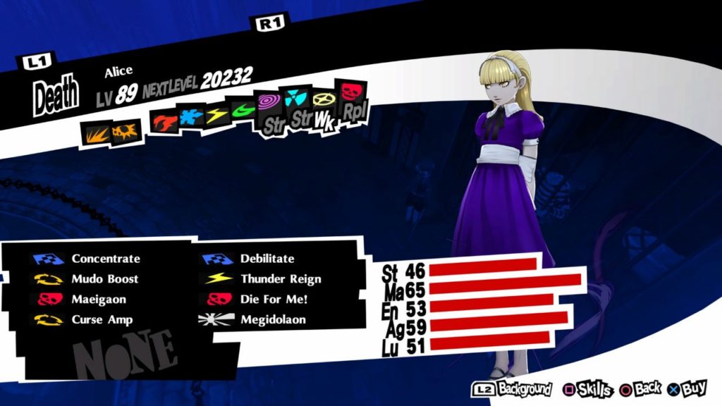 In molti JRPG la build one-shot è poco utilizzata, complice la minima chance di farla funzionare e l’inutilità contro i boss. In Persona 5 Royal, o in realtà in buona parte del Megaten, questa build è estremamente efficace per l’esplorazione di dungeon e i mini boss. Per farla funzionare basta semplicemente concludere il confidante della morte , Takemi, e fondere il suo Persona rappresentante: Alice. Alice è un Persona estremamente forte, che vanta la perfetta combo per one-shot build. La sua skill unica è “Muori per me” , che ha altissima probabilità di shottare, quasi certa a meno di immunità allo status morte, e il suo tratto distintivo aggiunto in Persona 5 Royal è “Muori” o “Just Die” in inglese, che azzera il costo delle skill che infliggono lo status morte.