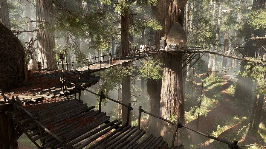 Kamino è infatti un pianeta oceanico, e la sua conformazione ricorda quasi una serie di isole interconnesse. Il vero motivo per Kamino è famoso è perché, come si vede in Episode II, è la sede del centro in cui vengono condotti gli esperimenti sulla creazione dei tanto famosi Cloni, generati dalla matrice umana del cacciatore di taglie Jango Fett. Sarà suo “figlio” Boba Fett, diversi anni dopo, a distruggere la fabbrica per ordine dell’Impero. Analogamente, è impossibile non menzionare Endor, la cosiddetta “Luna Boscosa” o “Luna Rifugio”, uno dei luoghi più iconici e indimenticabili dell’immaginario di Star Wars e che ovviamente ritorna anche in Star Wars Jedi: Fallen Order. Noto per essere la casa dei tutt’altro che innocui, ma splendidi da vedere, Ewok, Endor è passata alla storia per essere stata il teatro dello scontro finale contro l’imperatore Palpatine, che ha di fatto segnato la fine delle ostilità, almeno fino al risveglio delle forze oscure, narrata all’interno delle ultime tre pellicole uscite in ordine cronologico.