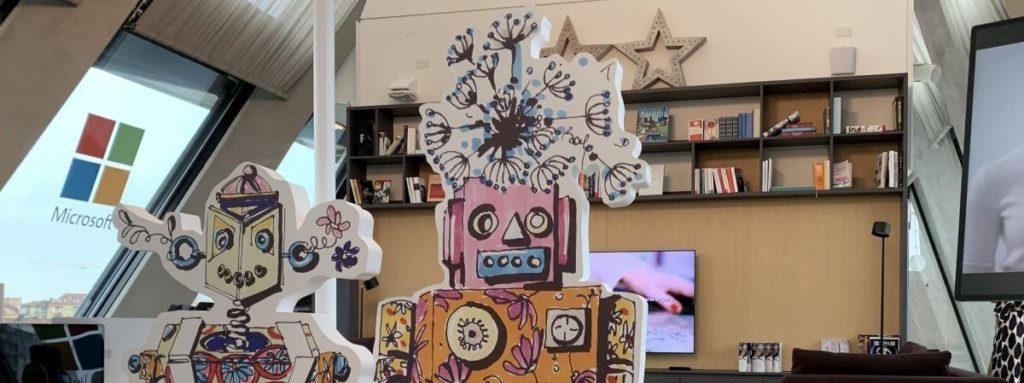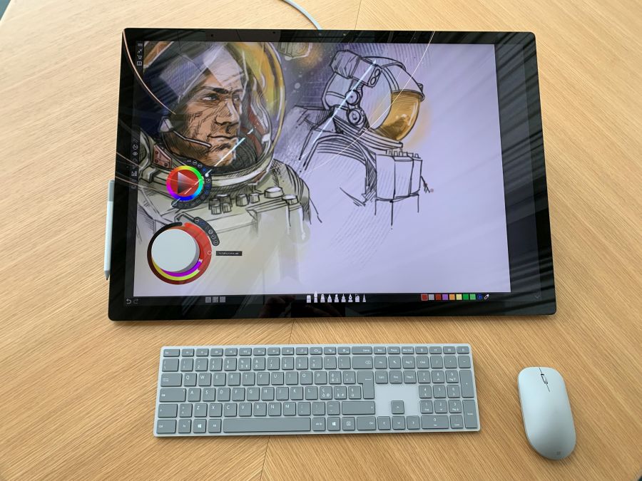 In un’area separata abbiamo potuto provare uno degli strumenti che lei più utilizza, il Surface Dial, e dobbiamo confessarvi che è davvero, come lo definisce Microsoft, un modo completamente nuovo di interagire e creare: lavorando su un progetto, immagine o disegno che sia, basta un clic sul Dial per passare dalla modalità zoom a una palette di colori completamente regolabile anche in contemporanea alla Surface Pen.