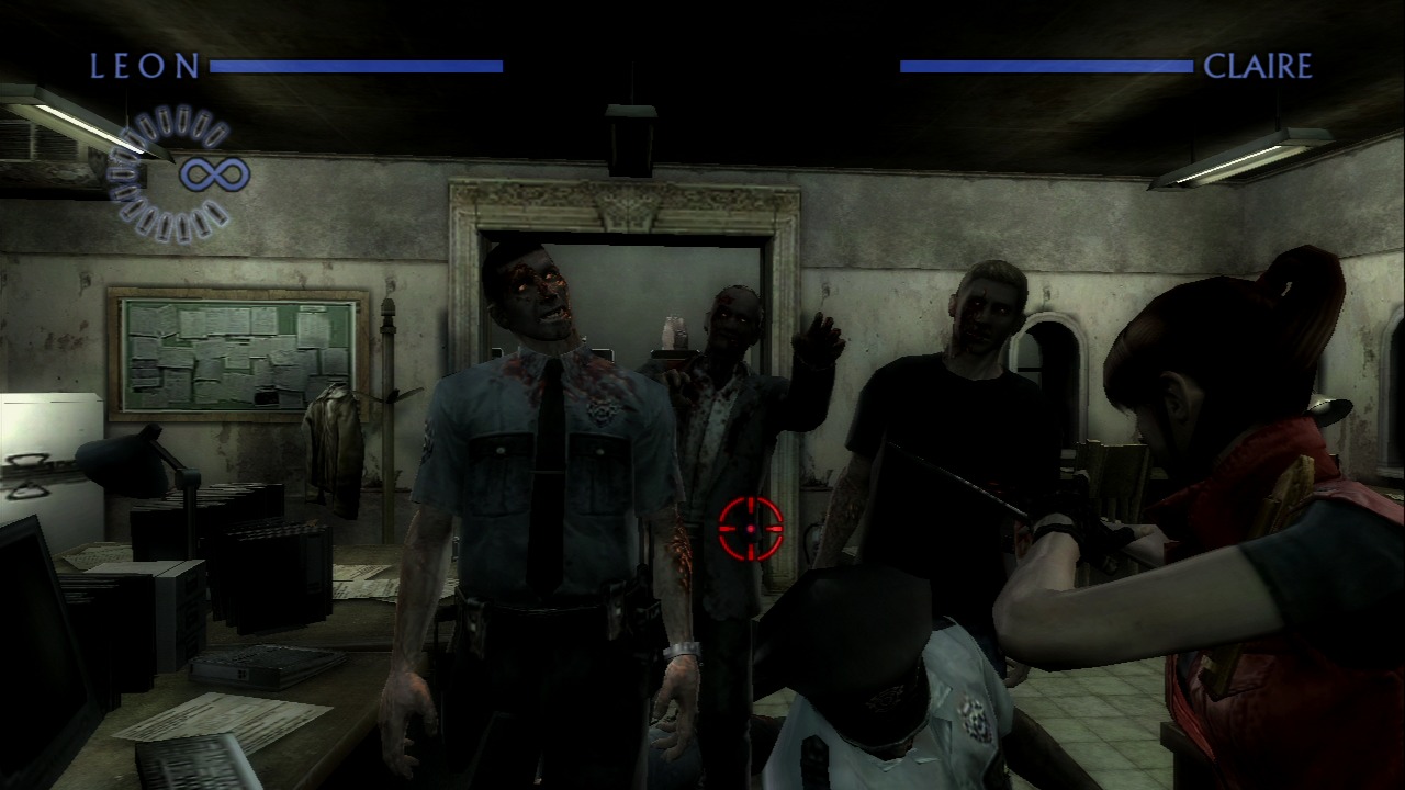 Ora arriva però la stangata più grande: proprio per conferire maggiore enfasi alla storia e contribuire a creare atmosfera, è stata introdotta una fantastica telecamera, talmente fantastica che sarà in più occasioni un vero e proprio ostacolo. Per farla breve, questa segue in tutto e per tutto i movimenti dei personaggi: se da un lato è un piacere per gli occhi in quanto sembra effettivamente di vivere in prima persona gli orrori di Raccoon City, dall’altro è un serio impedimento alla mira poiché sono più le volte in cui questa è in movimento che quelle in cui ci permette di uccidere nemici, raccogliere oggetti e quant’altro. Una sfida più grande per i giocatori? No, semplicemente un ostacolo al divertimento: The Umbrella Chronicles, seppur in minima parte, vantava una componente “esplorativa” nel suo essere uno sparatutto su binari. In Resident Evil: The Darkside Chronicles non c’è data materialmente la possibilità di esplorare le ambientazioni! La maggior parte dei tempi morti li trascorreremo ad osservare i personaggi che dialogano tra loro e quando questo non accade, ci penserà la telecamera a impedirci anche solo di osservare lo scenario circostante!