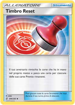 Timbro Reset è il nuovo N. Con una doppia differenza che lo rende ancora più forte. Si tratta di una Carta Strumento e non di una Carta Aiuto quindi può venire utilizzata in combinazione con altre carte, inoltre, rimischia esclusivamente la mano del tuo avversario. Se il tuo avversario è in vantaggio di Premi, l’utilizzo di questa Carta potrebbe lasciarlo con una sola carta in mano: questo permetterebbe di recuperare da una posizione di svantaggio e lasciare l’avversario al Top Deck. Se N era una carta forte, in seguito bannata, questa lo è ancora di più e ci aspettiamo di trovarne almeno una in ogni mazzo. Se il Mewtwo e Mew GX Alleati è la carta Pokémon più forte, questa la possiamo considerare la carta Strumento più forte, senza rivali.
