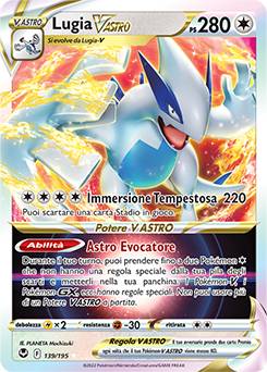 Lugia VASTRO è la carta principale dell’espansione Tempesta Astrale. Abbiamo inserito anche Lugia-V semplicemente perché al primo turno permette di scartare una carta e pescarne tre qualora la mano iniziale non avesse carte utili. La combinazione fra Lugia VASTRO e Archeops è una delle più utili dell’intero formato standard. Utilizzando Astro Evocatore, Lugia VMAX va a recuperare due Pokémon Incolore dalla pila degli scarti e li mette in panchina, questi sono gli Archeops che non necessitano dell’utilizzo delle carte fossili per venire giocati e si basano unicamente sull’abilità del Lugia. Avere due Archeops in panchina significa riuscire a caricare l’attacco di Lugia VASTRO in un solo turno e sferrare un’offensiva già nei primi turni di gioco. Ad aumentare ulteriormente l’offensività di Lugia VASTRO è l’abilità degli Archeops che vanno a cercare delle Energie Speciali direttamente dal deck aprendo a una vasta gamma di scelte decisamente utile.