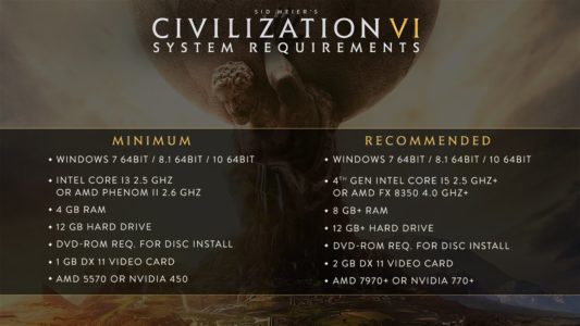 Come riporta l’immagine che vi proponiamo in basso, sono stati comunicati i requisiti minimi e raccomandati per Civilization VI, in uscita su PC il 21 Ottobre. Si tratta di un titolo che non spinge certamente al massimo il vostro PC, e soprattutto quelli minimi non sembrano essere eccessivamente esosi.