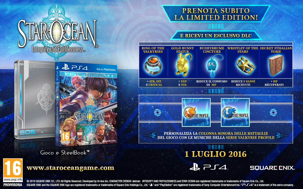 La Limited Edition, venduta al prezzo di 59.99€, conterrà il gioco e la steelbook, cinque contenuti aggiuntivi scaricabili e due BGM delle battaglie dalla serie Valkyrie Profile.