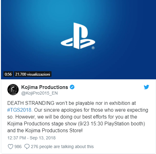 Lo studio ha confermato, anche tramite un tweet, che Death Stranding non sarà giocabile all’evento, né sarà in mostra, vi sarà solo una presentazione sul palco, tutto qui. Comunque c’è da dire che anche questo è motivo di eccitazione.