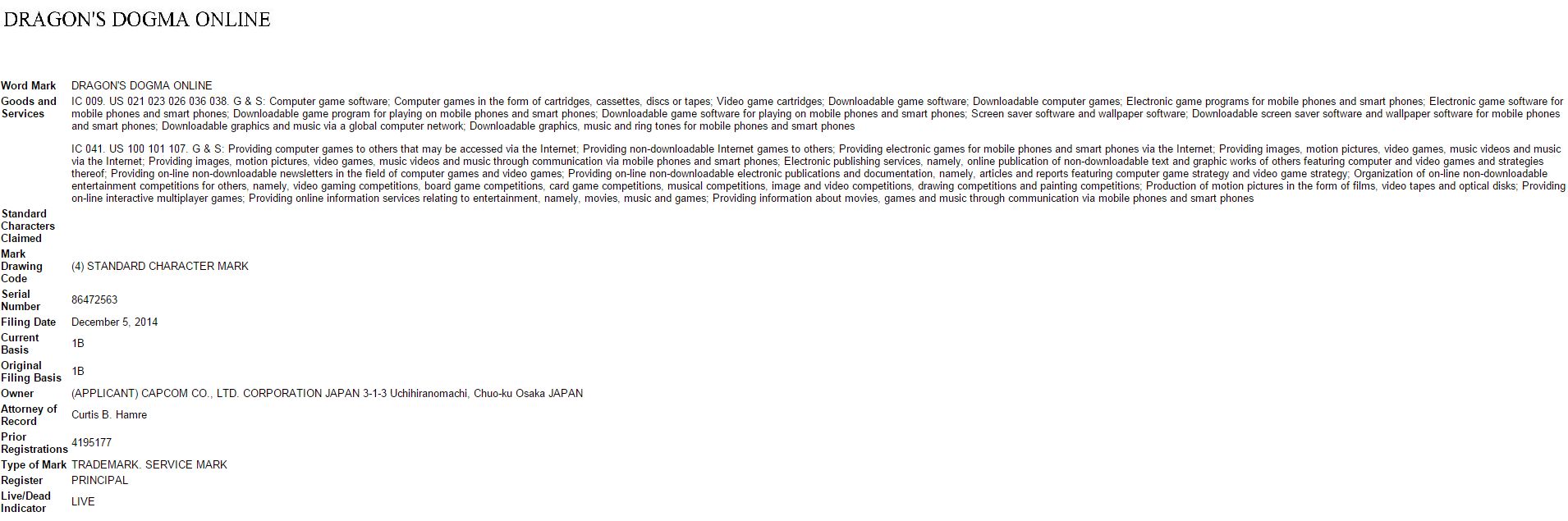 In particolare, il trademark giapponese compare con la traduzione nella scrittura katakana “ドラゴンズドグマ オンライン”, che potete vedere qui a seguire.