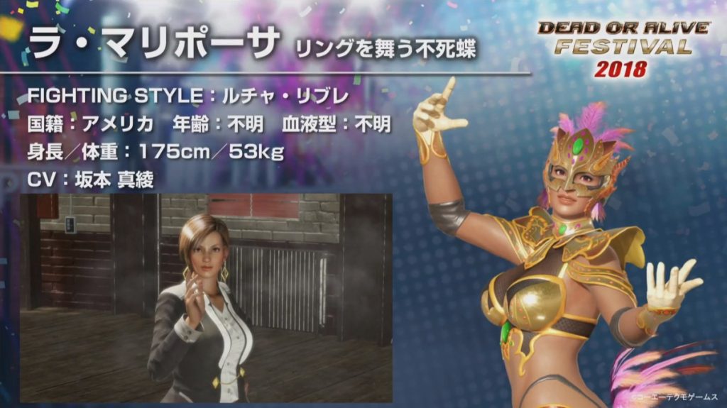 Due di essi sono veterani della serie: si tratta infatti di Kokoro e Lisa “La Mariposa”. La prima, un apprendista geisha esperta nell’arte marziale del baji quan, pare mostrerà un lato più serio di sé rispetto ai titoli precedenti a causa di alcune verità da poco venute a galla. La seconda invece, completamente guarita dalle ferite riportate in Dead or Alive 5, è “rinata come una fenice” e si mostra pronta a portare nuovamente in campo il suo stile di lucha libre.