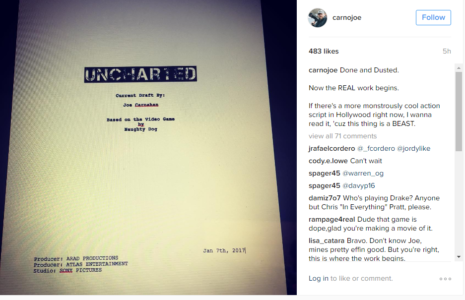 Le voci su un film dedicato alla serie di Uncharted sono sempre state molto vive, ma nella giornata di ieri (dopo parecchio tempo senza alcuna novità) ecco che lo sceneggiatore Joe Carnahan ha pubblicato su Instagram una importante immagine. La foto ritrae infatti quello che pare essere una sceneggiatura (o un copione) del film “Uncharted“, che qui sotto vi proponiamo. Il film dovrebbe essere diretto da Shawn Levy.