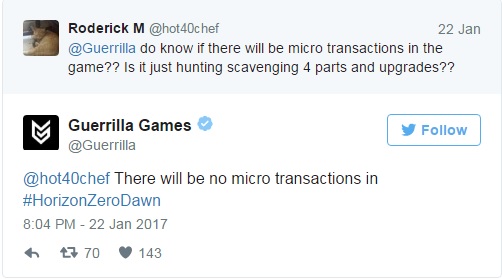 La conferma arriva da un tweet proveniente dal profilo del team di sviluppo, in risposta alla domanda ben precisa di un utente. D’altronde nemmeno Sony aveva fatto presupporre il contrario. Horizon infatti è un titolo che punta sulla campagna singola, per cui inserire transazioni per l’acquisizione di migliorie e potenziamenti sarebbe sembrato assolutamente fuori contesto.