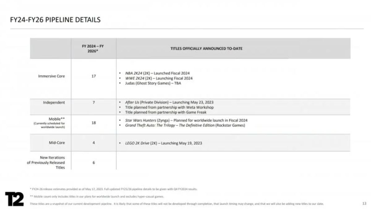 La supposizione portata a galla da WCCFTech ha delle basi concrete, nella misura in cui trae ispirazione dall’ultimo documento finanziario di Take Two Interactive. Per l’occasione, il colosso statunitense ha mostrato il suo prospetto per il futuro prossimo, con sedici giochi da pubblicare entro la fine dell’anno fiscale in corso, ovvero il 31 marzo 2024.
