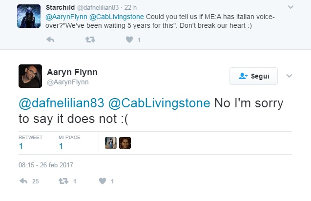 Attraverso un tweet Aaryn Flynn, studio general manager e vice-presidente di BioWare, ha confermato ufficialmente che in Mass Effect Andromeda non sarà presente il doppiaggio italiano.