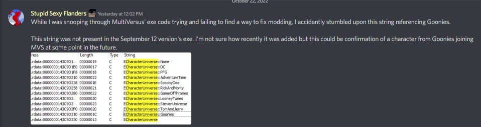 Attraverso un nuovo leak, si scopre che il team di sviluppo al lavoro su MultiVersus è pronto a rilasciare una serie di personaggi incentrati sul franchise degli anni 80′, nonché il cast dei I Goonies. Com’è possibile vedere dall’immagine qui sotto, il team dopo aver inserito Rick e Morty e pronto ad aggiungere al roster Sloth e Mikey.