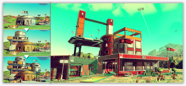 Ecco arrivare finalmente uno dei desideri più esposti dai fan di No Man’s Sky. Si potranno infatti costruire delle enormi basi, con un sistema molto semplice e intuitivo. Si potrà così reclamare un pianeta “casa” e costruirci una propria base, decorando con tutti gli oggetti visti durante le nostre avventure. Si potranno reclutare gli alieni, per utilizzarli come aiutanti nella ricerca di nuove tecnologie. Arrivano anche i teletrasporti “Terminus” che consentiranno di raggiungere la vostra base. Se trovate una posizione migliore per costruire la vostra base, nessun problema. Potrete smontarla e costruirla in un altra parte, e tutte le spese verranno rimborsate al giocatore.