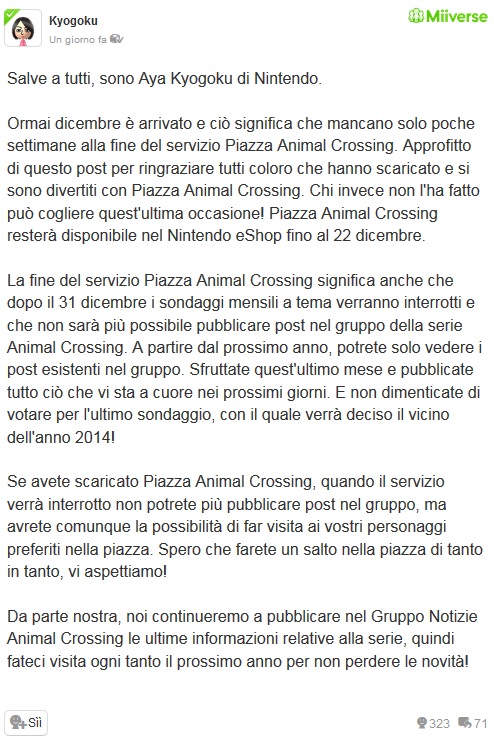 Nintendo ha pubblicato su Miiverse un messaggio dove avvisano che a fine dicembre verrà interrotto il supporto alla Piazza Animal Crossing su Wii U. Tuttavia, avvisano anche che sul gruppo continueranno ad essere postate notizie, e che nel 2015 faremmo meglio a farvi visita ogni tanto per non perderci le novità. Forse un indizio sul fatto che è in lavorazione Animal Crossing per Wii U?