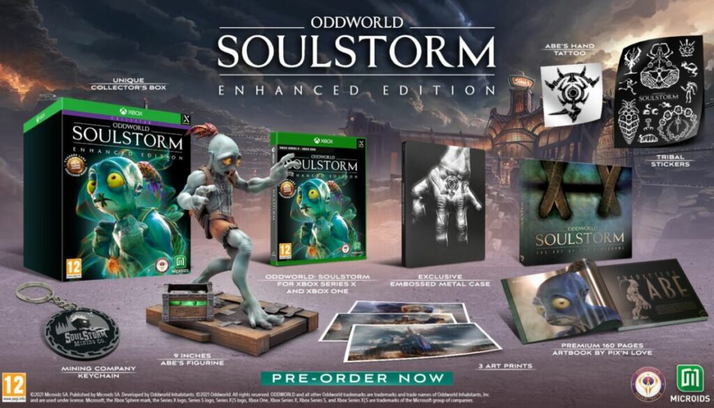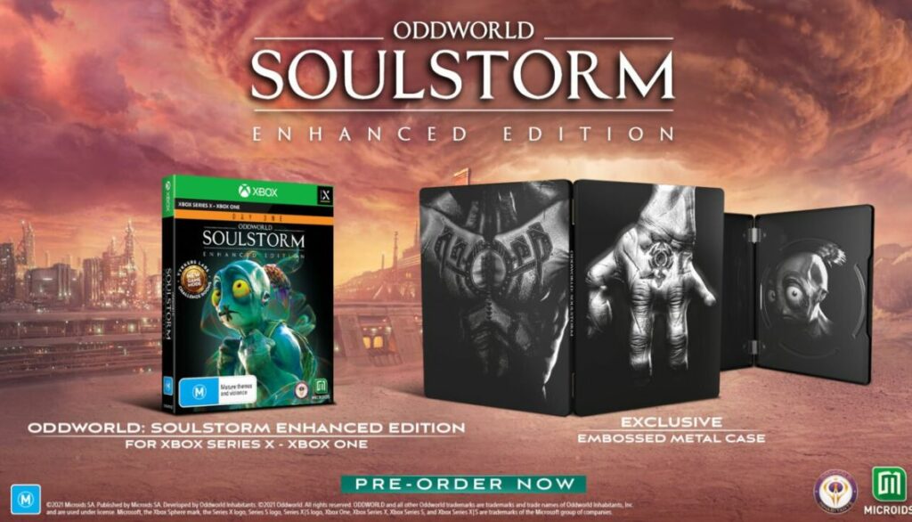 Questa edizione include tutti gli aggiornamenti precedentemente pubblicati, delle migliorie alle meccaniche di Gameplay e una serie di ulteriori contenuti. Tale iniziativa segnerà ufficialmente il debutto della saga su console Microsoft con il più recente episodio. qeOddworld Soulstorm Enhanced Edition verrà venduto in formato digitale al prezzo di 39,99 dollari e in due distinte edizioni fisiche per Xbox One e Series X|S. La Day One Edition da 49,99 dollari, con una custodia Steelbook in rilievo e la Collector’s Edition da 149,99 dollari, al cui interno troveranno posto una statua di Abe alta 22 cm, un artbook di 160 pagine, tre stampe artistiche, un portachiavi della Soulstorm Mining Co. e la medesima steelbook in rilievio della Day One Edition.