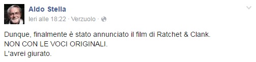Vi abbiamo parlato poco fa della scelta di Lucky Red di inserire nel cast di doppiaggio del film di Ratchet & Clank due youtuber (Favij e Greta Menchi). Se questa prima scelta potrebbe risultare discutibile ma comunque comprensibile, quella di dare nuove voci ai personaggi protagonisti, eliminando così i doppiatori storici, non riusciamo proprio a spiegarcela e insieme a noi anche Aldo Stella (Doppiatore di Clank), che alla scoperta della notizia si è sfogato sui suoi social network.