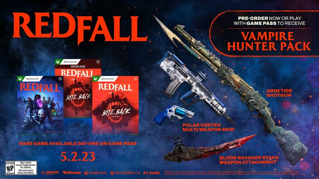 Per quanto riguarda invece il bonus ottenibile su Redfall tramite preordine o giocando tramite Game Pass si parla del Vampire Hunter Pack che include l’esclusivo fucile Grim Tide in grado di aumentare il proprio danno del 20% per 8 secondi dopo aver ucciso un nemico. Inoltre sarà disponibile la skin per armi Polar Vortex e l’inserto per armi Blood Ravage Stake.