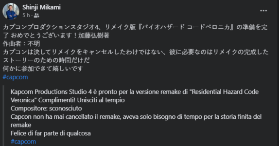 Proprio oggi, il papà di Resident Evil, Shinji Mikami, ha condiviso un post sulla sua pagina Facebook dove annuncia con entusiasmo l’inizio dello sviluppo da parte di Capcom Production Studio 4 del remake di Code Veronica, specificando che i lavori sul rifacimento di questo titolo non sono mai stati cancellati ma solo temporaneamente accantonati per dare il tempo di terminare la storia.