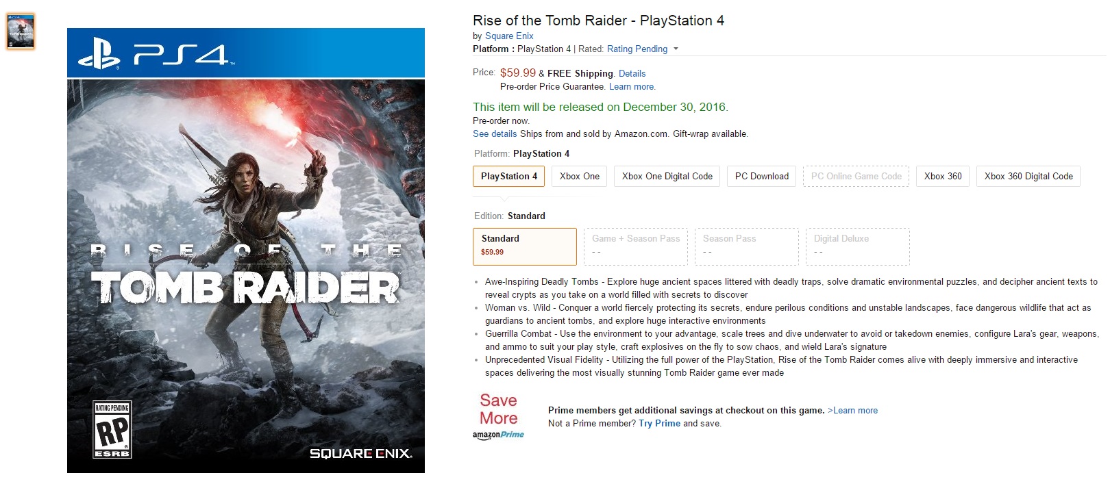 Sembra che Rise of the Tomb Raider su PS4 sia finalmente approdato su Amazon.com, che dopo poco tempo dalla versione PC mette in listino anche quest’ultima versione.