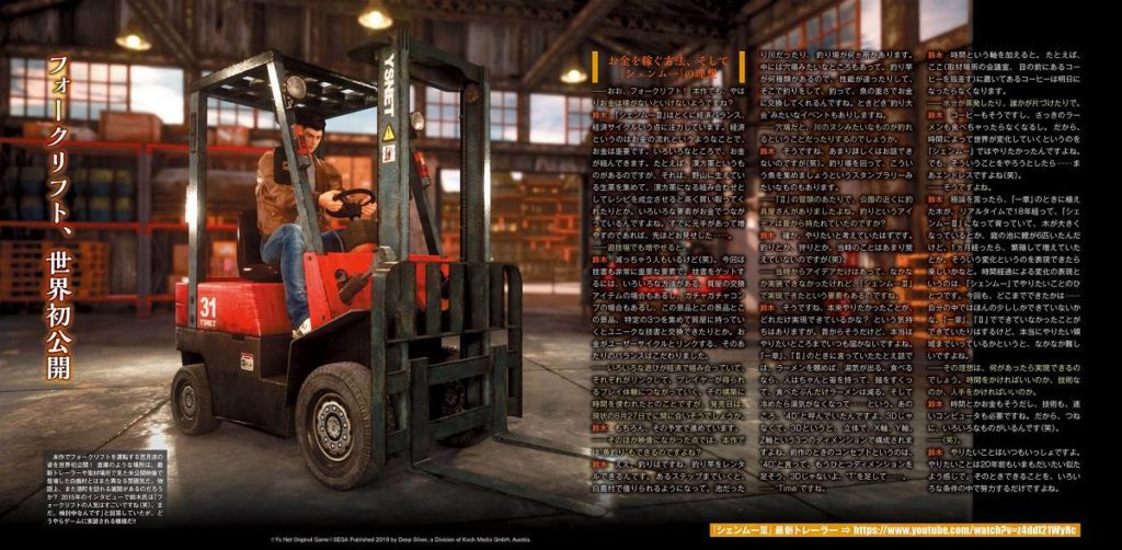 Infine, proprio come suggerisce l’immagine del muletto, torneranno i lavori part-time che Ryo potrà svolgere per guadagnare del denaro. Yu Suzuki ha voluto rendere proprio il denaro un elemento importante, con diverse meccaniche di gameplay collegate all’acquisizione di soldi.