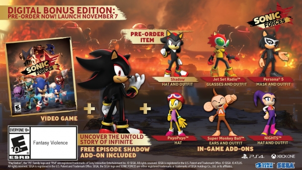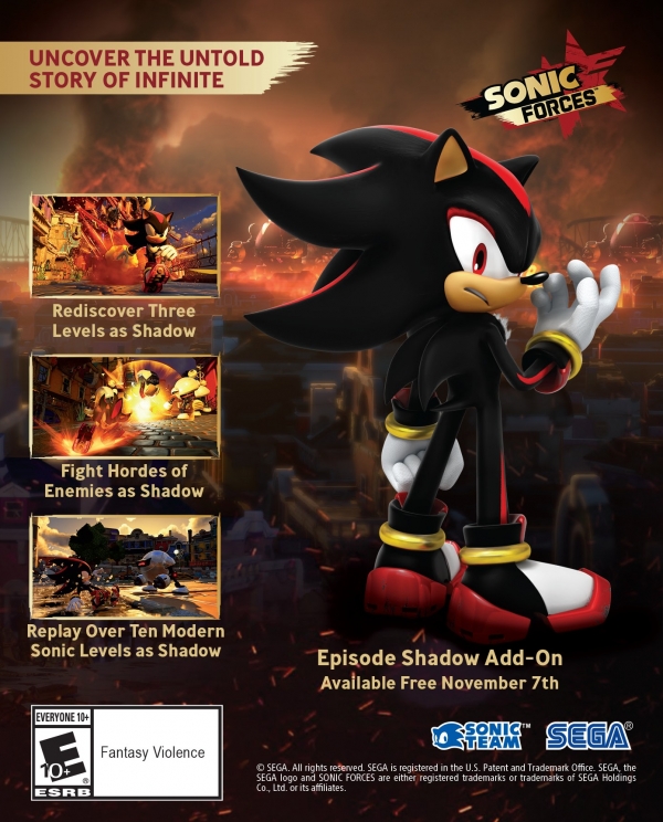L’episodio di Shadow sarà incentrato sul misterioso passato tra quest’ultimo ed Infinite, e includerà tre stages aggiuntivi da giocare esclusivamente con Shadow. Inoltre, il DLC permetterà di rigiocare alcuni dei livelli di Modern Sonic nei panni del porcospino nero. Come aggiunzione per chi ha invece preordinato la Digital Bonus Edition, disponibile al momento solo su PlayStation 4 e Xbox One, riceverà un costume di Shadow da far indossare ai loro eroi. Il preordine per la Digital Bonus Edition sarà online a partire dal 21 Settembre 2017, e potete prenotare sullo store ufficiale di Sonic Forces.