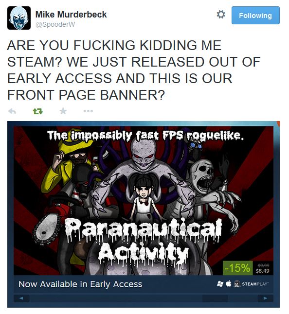 Questo ha scatenato l’ira di Mike, che ha scritto una serie di Tweet accusando Steam di incompetenza, disinformazione, e di causare in questo modo un calo delle vendite del suo gioco, il tutto con toni non certamente pacifici o privi di volgarità.