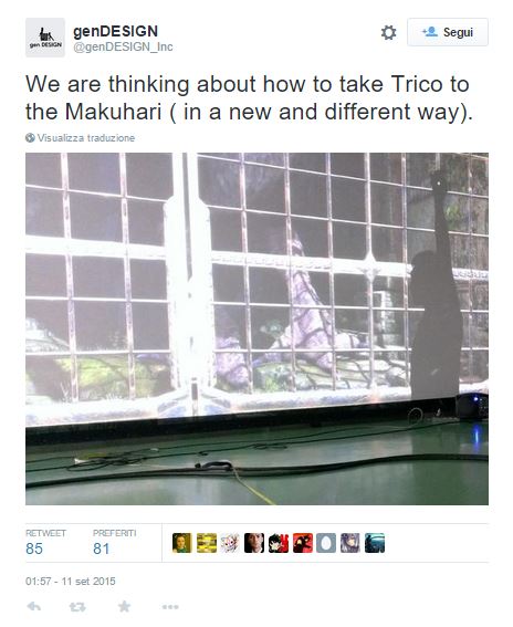 La presenza di questo titolo all’evento giapponese è stata annunciata tramite Twitter dalla stessa genDESIGN, che ha condiviso una foto che ritrae Trico intrappolato in una gabbia accompagnata dalla scritta “Stiamo pensando a come trasportare Trico fino a Makuhari (luogo dove si terrà l’evento)”. Non sappiamo ancora nulla riguardo a cosa sarà presentato e non ci resta che aspettare il Tokyo Game Show che si svolgerà dal 17 al 20 settembre.