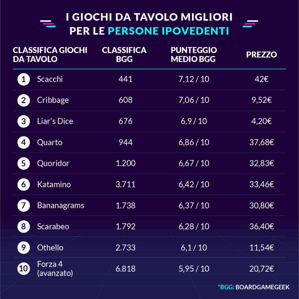Sulla base delle classifiche di Board Game Geek LenStore ha anche stilato una lista dei giochi da tavolo più accessibili a tutti in cui, a occupare la prima posizione, sarebbero i classici scacchi, basati su regole ormai note e dalle forme dei pezzi perfettamente riconoscibili. A seguire sul podio vi sarebbero il gioco di carte Cribbage, basato su un punteggio tattile, e Liar’s Dice, gioco reso intuitivo dalla presenza dei dadi.