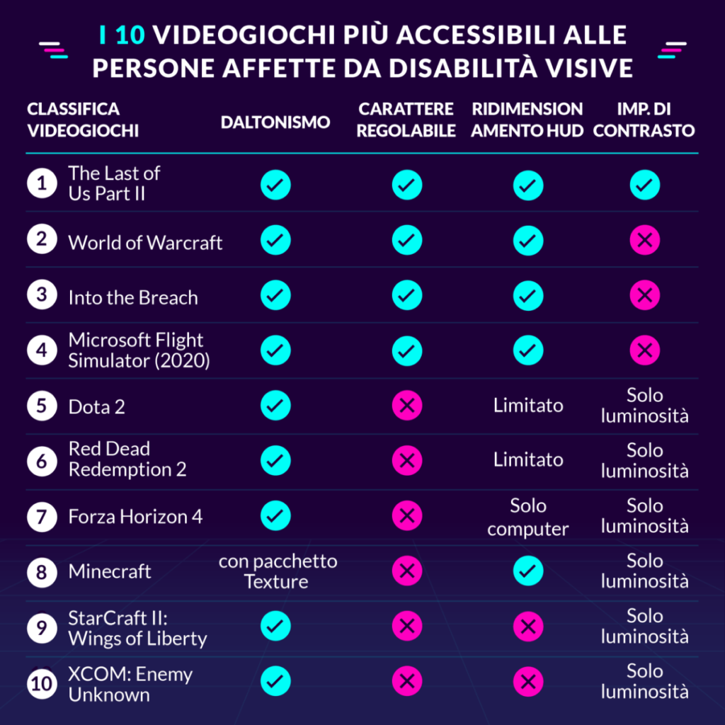 Analizzando i titoli più recenti, The Last of Us Part II conferma la propria posizione, seguito da Microsoft Flight Simulator e da Yakuza 0. Altri titoli, come Crusader Kings III, Ori and the Will of the Wisps, Hades e F1 2020 hanno invece ottenuto scarsi risultati per quanto riguarda l’accessibilità a causa delle loro poche possibilità di personalizzazione.