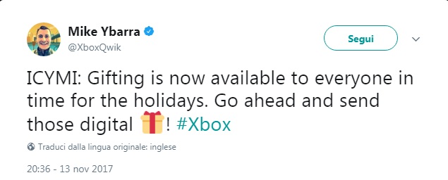 Nel luglio 2017 si era alzata la questione su una possibile funzione che avrebbe permesso ai possessori di Xbox One di regalarsi l’un l’altro titoli digitali acquistati presso Xbox Store. Nell’ultimo periodo, Mike Ybarra ha annunciato che questo nuovo sistema è attualmente disponibile per tutti coloro che posseggono una Xbox One e, ovviamente, una Xbox One X.