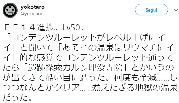 Lo scorso mese ha rivelato come il suo nuovo personaggio abbia raggiunto il livello 30 all’interno del titolo, al quale gioca tutt’oggi. In data odierna, infatti, Yoko Taro ha pubblicato un tweet in cui afferma di aver raggiunto il livello 50.