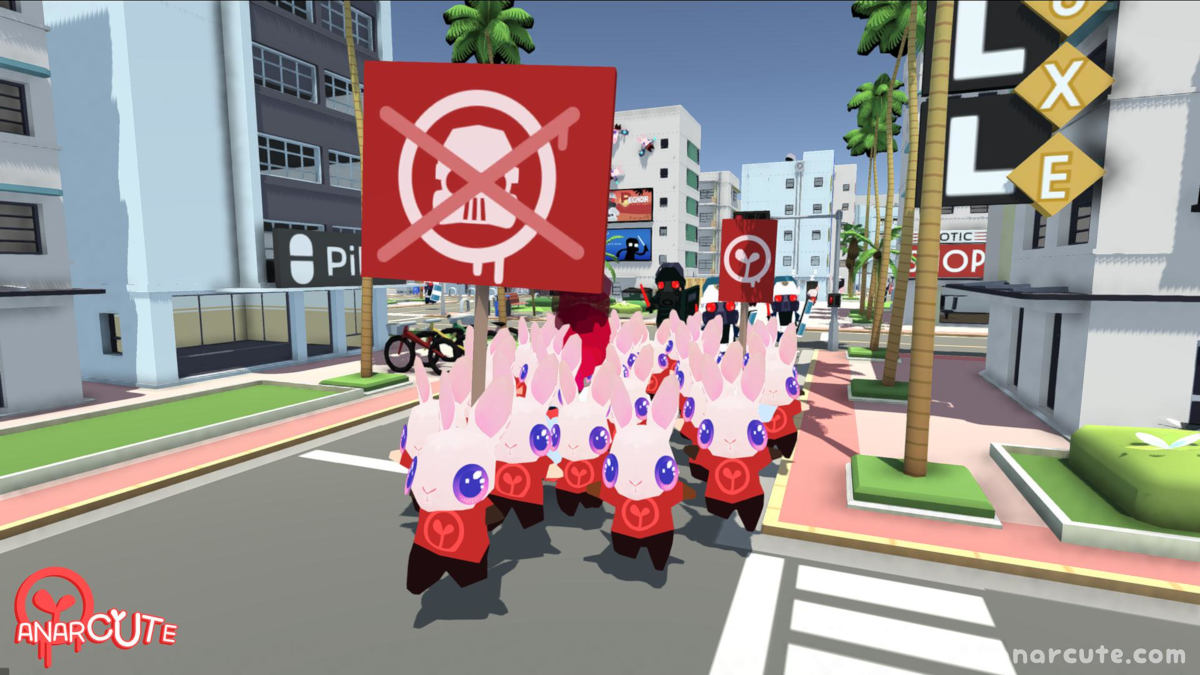 Prendendo in prestito l’idea alla base di The Wonderful 101 di PlatinumGames, Anarcute si presenta come un action adventure tridimensionale con visuale isometrica, caratterizzato dalla necessità di controllare una folla di personaggi. All’inizio di ciascun livello, il giocatore ha a disposizione un (tendenzialmente) contenuto manipolo di animaletti, ma gli ambienti celano molti compagni, da liberare o da risvegliare. Aumentare il numero di rivoltosi non conferisce il mero vantaggio di una forza incrementata, ma anche la possibilità di accumulare più oggetti, quasi fossimo in Katamari Damacy, da lanciare contro nemici e strutture (automobili, sedie a sdraio, biciclette… quello che trovate per strada!), oltre a nuove mosse e abilità, fra le quali spicca quella di abbattere interi grattacieli!